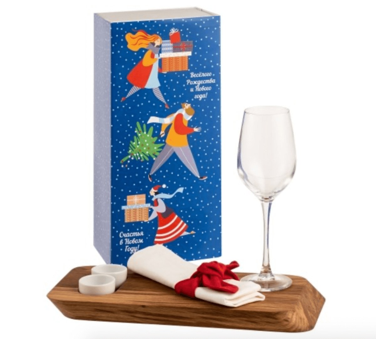 Стильный и лаконичный подарок на Новый год. В набор входит сервировочная доска из натурального дуба, два фарфоровых соусника, стеклянный бокал для вина и белая льняная салфетка с декоративным кольцом.