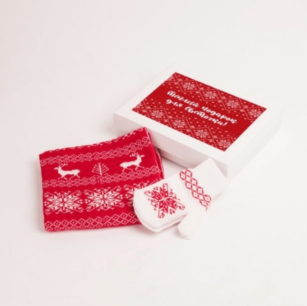 Тёплый комплект из варежек и шарфа с рождественским орнаментом подарит ощущение комфорта и уюта во время зимних прогулок.