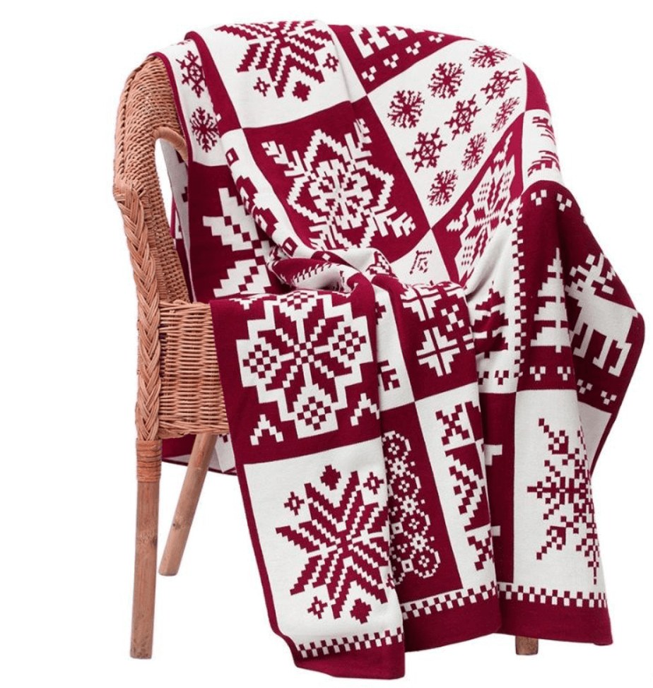 Более традиционный вариант теплого подарка — классический плед с зимними узорами в скандинавском стиле.