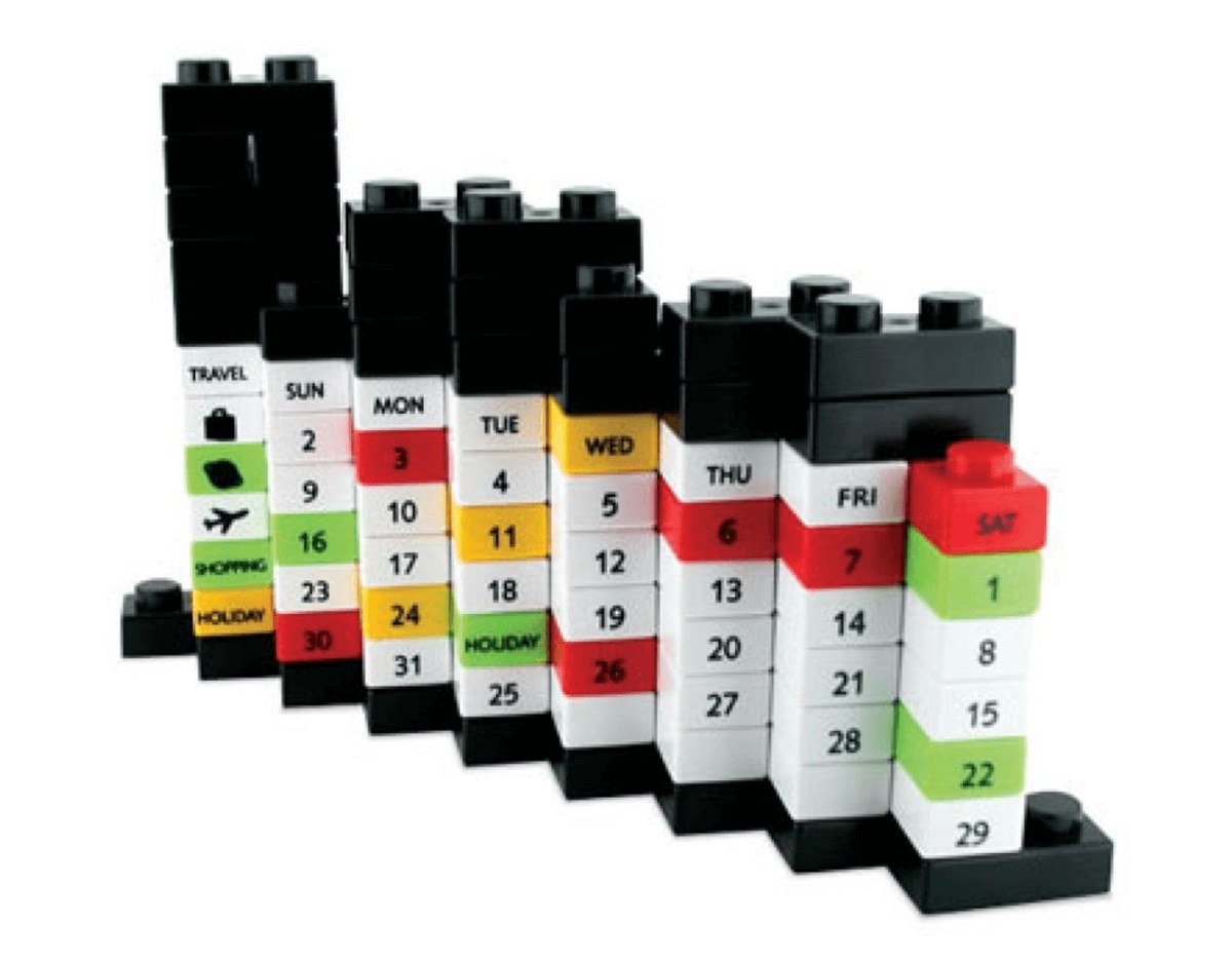 Необычный календарь из блоков совмещает в себе сразу несколько функций — он может быть календарем и конструктором одновременно! На кубики нанесены названия дней недели, числа месяцев и иконки, обозначающие события, с помощью которых можно отмечать на календаре нужные даты.