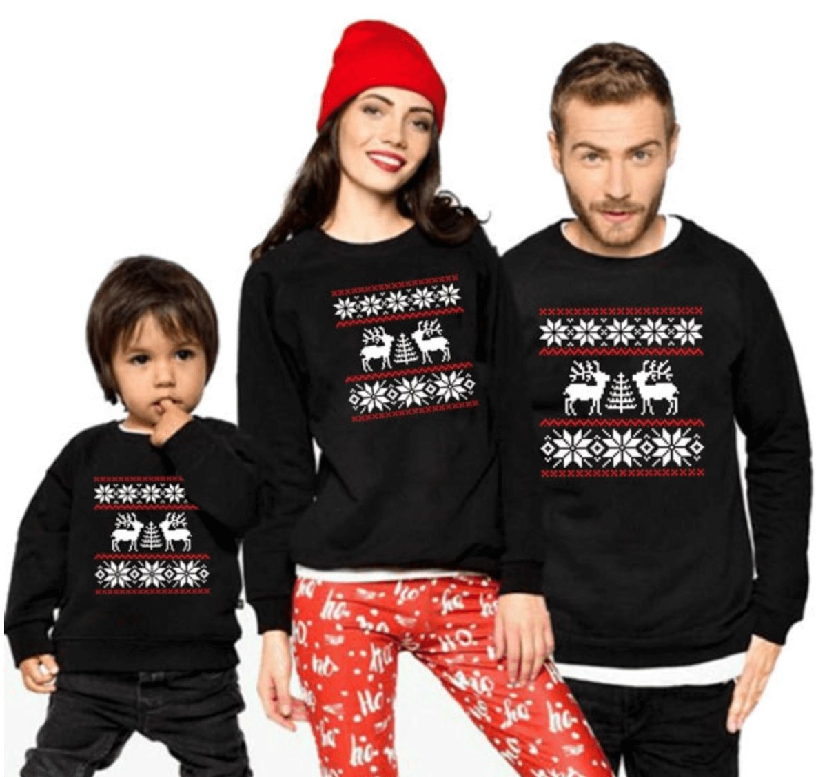 Еще один вариант новогодней одежды для всей семьи — одинаковые свитшоты в скандинавском стиле.