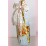 Вырежьте подходящий по размеру мотив из рисовой бумаги для декупажа, наложите на бутылку и поверх рисунка нанесите клей.
