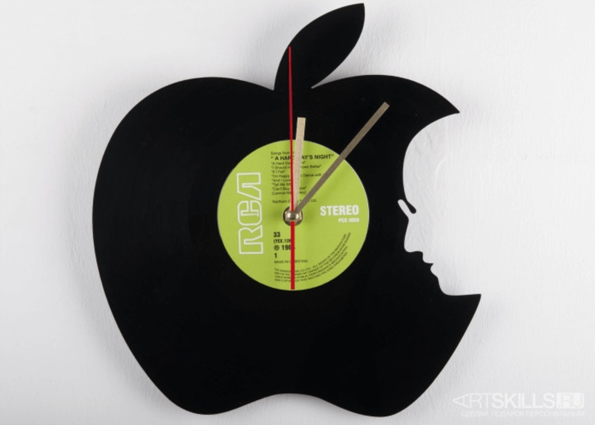 А тем, кого вдохновил в своё время основать корпорации Apple Стив Джобс, понравятся часы из виниловой пластинки «Гениально!» (каждый день видеть любимое яблоко и портрет гения на стене — бесценно!).