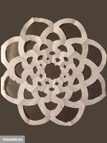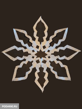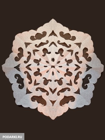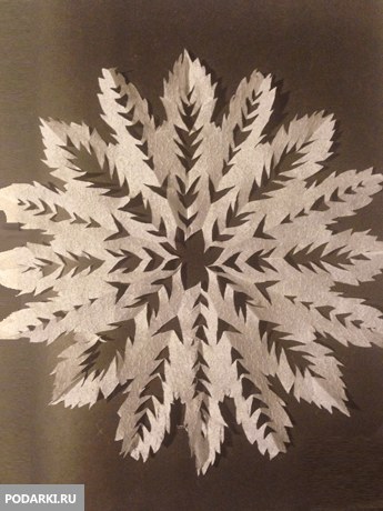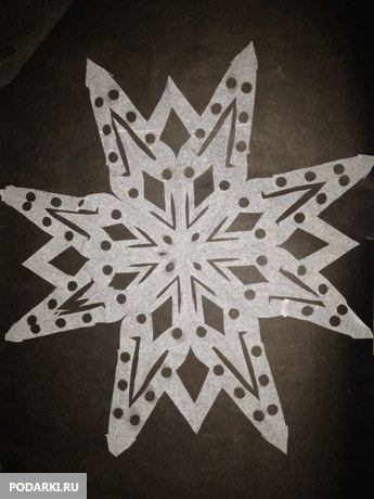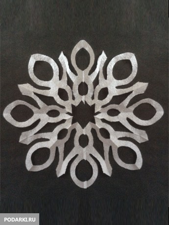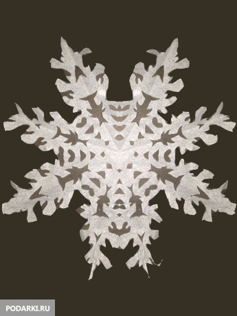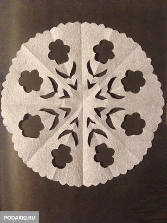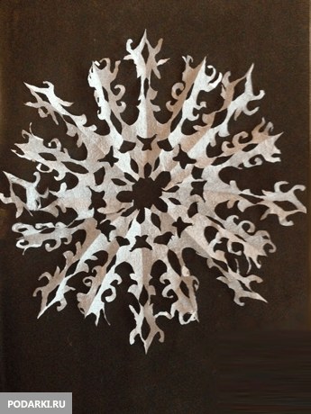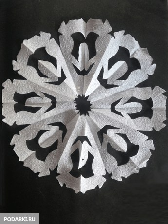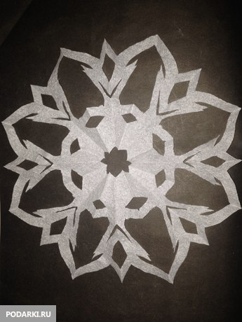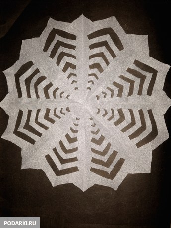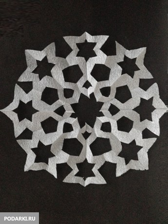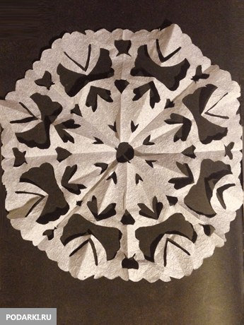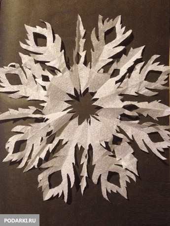 Разворачиваем салфетку и получаем красивую снежинку. Чем более тонкая бумага используется и чем более сложный узор, тем аккуратнее следует разворачивать вырезанную снежинку, чтобы случайно не порвать.