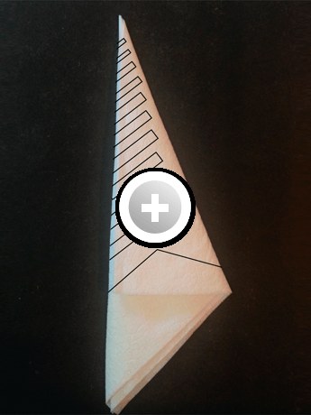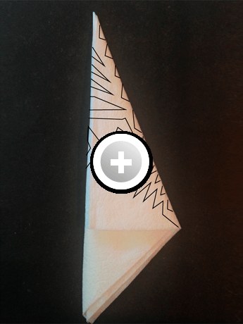 Складываем еще раз, как показано на фото, при том, что середина бумажного листа (в развороте) должна быть самым острым углом полученного треугольника, иначе снежинка не получится. Затем вырезаем узор.